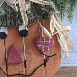 Primitive wood pumpkin scarecrow head wall hanging that measures 11.5" high to the top of the hat and 9.25" wide. Great for fall harvest, Halloween, or Thanksgiving decor.