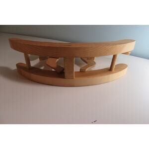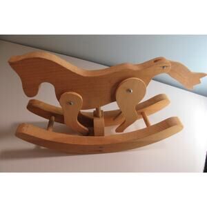 Wood Rocking Horse Toy With Moving Legs and Tail. Legs move back and forth as the horse is rocked. Nice smooth wood. Rocks evenly. Stands 5.5 inches tall and 12 inches long.