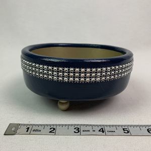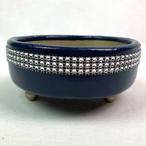 Stunning muted dark blue & metallic silver painted trinket dish: Handcrafted and repurposed, this unique dish boasts a pewter silver metallic interior and is adorned with silver-toned jewels. Versatile, it's perfect for jewelry, coins, keys, and more. A must-have for your entry hall, bedroom, den, office, bath, and beyond.