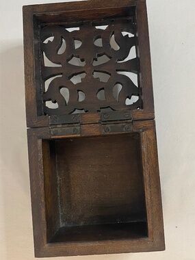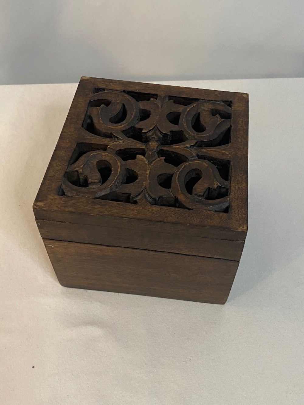 Cute stained wood trinket box. Sat on my dresser for a number of years. No huge scratches. Great condition.