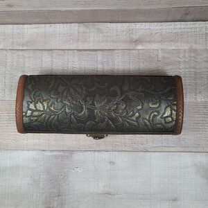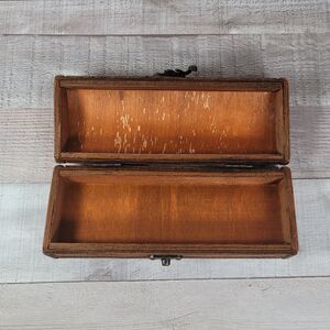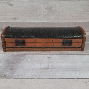 Vintage hand made trinket box for display or use on table top, desk or dresser to hold mementos, pens, keys etc. Painted fabric texture on domed lid gives it a punched tin appearance, hinged top and swing arm clasp on front. Measures approximately 8.75" x 3" x 2.25" and is in good preowned condition.