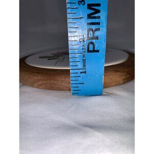This ceramic trivet is set inside a wood frame measuring 7" dia.