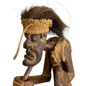 Wood African Tribal Sculpture Statue of Native Man With Hair Hand Carved 23 in