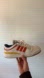 Beige Adidas sneakers featuring bold red stripes and a yellow accent. Classic style with a gum sole.