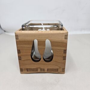 Add a touch of rustic charm to any room with this beautiful candle holder from Wood You Tell Me Inc. The cherry wood design with cut-out details and glass insert creates a unique and stylish way to display your favorite candles. Suitable for all occasions and suitable for any furniture, this medium-sized candle holder is perfect for any adult space, whether it's a living room, bedroom, or office. The hand-made and pieced together features of this candle holder add to its unique character, making it an original piece that will add warmth and personality to any space.