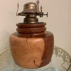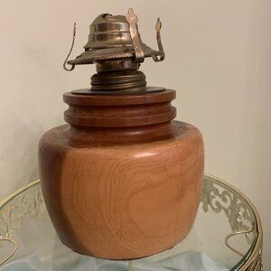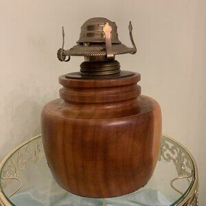 Wood and Brass Oil Lamp Base. 6.5". No Chimney. Beautifully Turned. Wood detail in pic one is not considered to be a defect. The last pic shows a scratch.