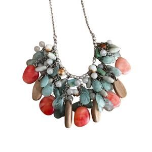 Vintage mixed materials bib necklace. Most likely from the early 2000s. Has faux turquoise and pink stones and plastic faceted beads mixed with wooden beads. It has a great summer beachy vibe. It has a crown emblem hanging from it, so possibly a Park Lane piece. It's adjustable and has a chain extension on it. Can be 14"-18" long.