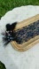 Embellished with black tulle flowers and black feather embellishment on the outside corner of the dish.