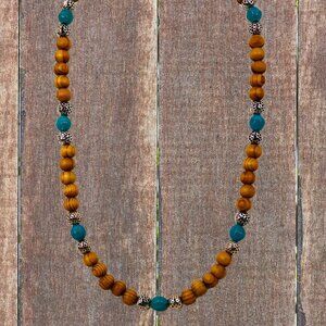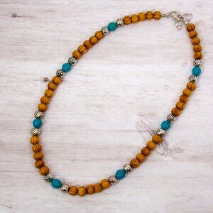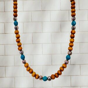 Wood bead necklace created with turquoise color beads and textured silver beads. The turquoise color beads are acrylic and the silver beads are silver plated with an antique finish in the texture. All the beads are 8mm round. A beautiful natural wood color necklace that is perfect for any occasion. New and never worn.