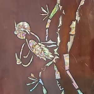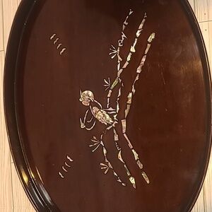 Beautiful oval serving tray with shell inlay. Used with signs of wear. Please see photos. Measures 20x14