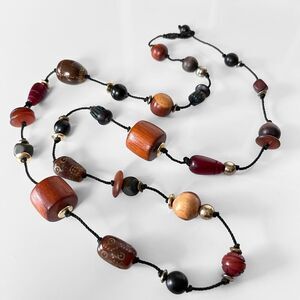 Wooden beaded necklace, some beads are painted with inlaid brass resembling faces or skulls. Strung on a black twisted cord that’s been hand knotted. 36” length