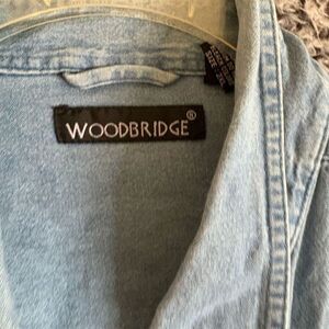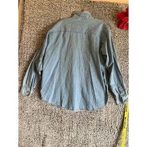 Keywords: wood bridge men's shirt, blue denim, button-up, casual wear, long sleeve, 2XL, embroidered patch, fall fashion, machine washable, Saudi Arabia, collared shirt, solid pattern, pre-owned, cotton fabric.
