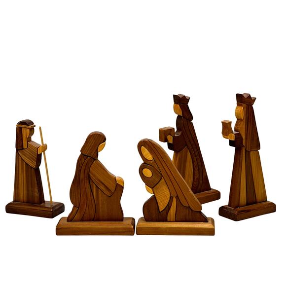 This is a beautiful, vintage 5-piece wooden Nativity set, handcrafted in 1999 and signed 'JM 99' Made in Canada. The set includes the Holy Family (Mary, Joseph, and Baby Jesus) and the Three Kings, each figure measuring between 5.5" to 7.5" tall and carved with care and attention to detail. This set would make a wonderful addition to your holiday decorations or a thoughtful gift for someone special. The warmth of the wood and the classic design evoke a sense of peace and joy. Embrace the spirit of the season with this charming Nativity set! # 5687