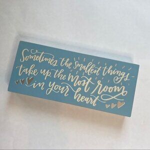 Baby blue wooden sign/wall hanging. “Sometimes the smallest things take up the most room in your heart”. Perfect for baby shower decorations or for a nursery. One small scuff on bottom as pictured.
