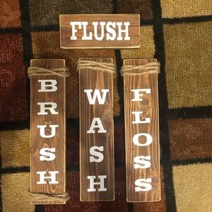 Neutral Wood boards with Brush, Wash, Floss and Flush for your Bathroom Decor
