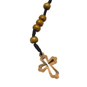 This rosary features wooden beads strung on a durable cord with a cross pendant and a Virgin Mary medal. It measures 14 inches in length, making it suitable for daily prayer or as an elegant religious accessory. The natural wood finish adds a touch of rustic charm.