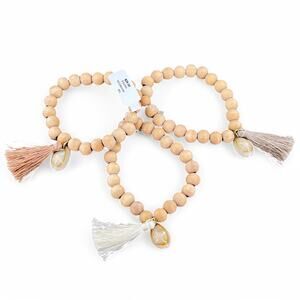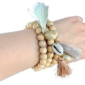 Wooden Bead Stretch Bracelet Cowrie Shell and Tassel Boho Lot of 3