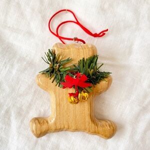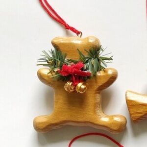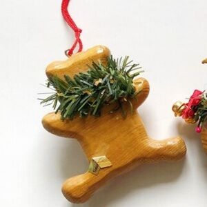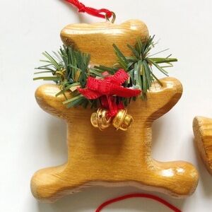 This delightful Christmas ornament features a charming wooden bear adorned with festive holiday decorations. The bear is crafted from polished wood, showcasing its natural grain and smooth finish. Around its neck, the bear wears a miniature wreath made of artificial pine needles, accented with a bright red bow and two tiny golden bells, adding a cheerful touch of holiday spirit. A red hanging loop completes the design, making it easy to display on your Christmas tree or as part of a festive arrangement. This ornament combines rustic charm with holiday cheer, making it a perfect addition to your seasonal decor or a thoughtful gift for loved ones.