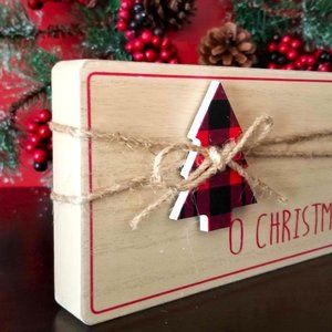 Decorate your home for the Winter/Christmas Holiday Season with this festive tabletop sign! Natural woodgrain, with a red & black buffalo plaid patterned Christmas tree, wrapped in jute cording.