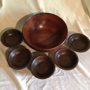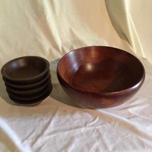 1 Large solid wood serving bowl and 5 solid walnut bowls from the Lebanon Walnut Factory. The large bowl is not walnut... it is super thick, heavy, and well made... and was used with the walnut bowls. Approximate sizes: Large Serving Bowl 10" diameter and walnut bowls 6" diameter. This is a vintage set that was lovingly used for years... normal wear with some scratches due to age. See pics as part of description. Great set for vintage at heart retro lovers! Smoke free.