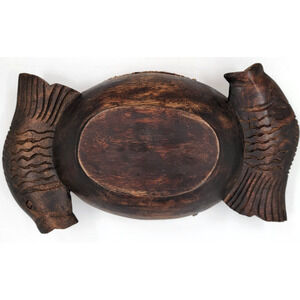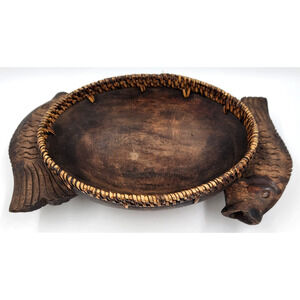 This handcrafted vintage wooden bowl trinket tray features a unique design with carved fish handles and a woven rim, adding a touch of charm to any space. The rich brown and beige colors add a natural and rustic feel to the piece, making it a perfect addition to any collection or decor. Its regular size of 8" X 6" makes it versatile for storage or display, showcasing the craftsmanship and attention to detail in its handmade creation.