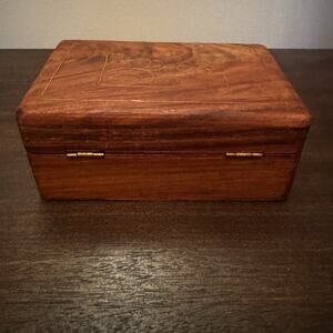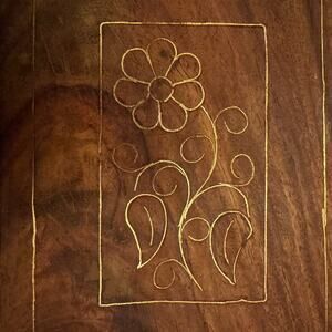Wooden Box Hand Carved Brass Inlaid Floral Hinged India Vtg Trinket Pen Artisan