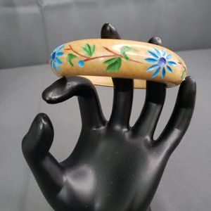 Wooden Bracelet Etched Floral Leaf Design Painted Size 7 1/2" Blue Green Brown
