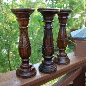 Here are three wooden candle holders. They have a design on each, two designs are the same and one is a bit different. They hold pillar candles up to 3 inches wide. The candlesticks are 12 inches tall and have felt on the bottom. These would be beautiful in a fall arrangement.