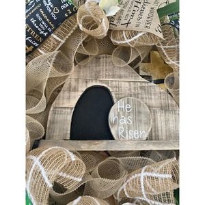 Wooden Christian He is Risen From the Tomb Sign Deco Mesh Ribbon Easter wreath