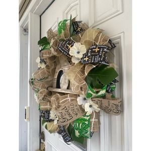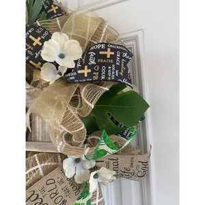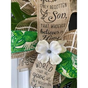 This Religious Wreath represents Jesus Christ our savior died on the cross to save us from our sins and rose from the tomb. It has a wooden tomb with stone rolled away, He is Risen sign, John 3:16 ribbon The palm leaves represent Palm Sunday when Jesus entered Jerusalem on a donkey. The palm branches represent victory & triumph over death.