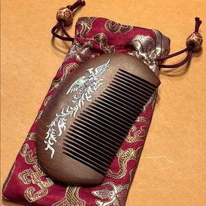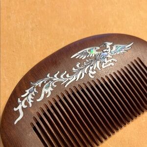 Smooth brown wooden pocket comb for men's grooming. Fine teeth detangle and shape hair with minimal static. Decorative iridescent inlay adds a refined touch. Portable design fits easily in a pocket or grooming kit. Brown finish complements daily routines.