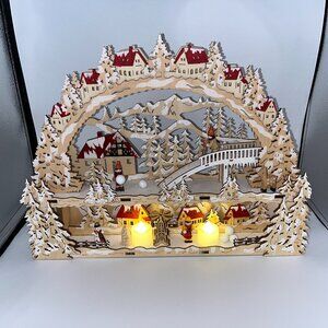 This is a gorgeous holiday display. There are little people with snowballs, skiing, a snowman, in this beautiful little town. This is supposed to run on batteries, however, the battery pack would need to be replaced and rewired. I added two flameless miniature candles and it looks just adorable lighted up with these two which are also included in this listing!