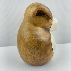 Wooden Folk Art. Boxer puppy dog round bodied figure. Hand painted with natural wood grain color for brown portions. Sad face. Floppy ears.
