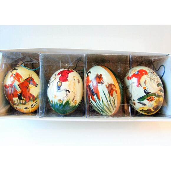 NEW Set (4) Hand Painted WOODEN EGG ORNAMENTS Horses Of War Asian Soldiers Horns - NEW In Box!