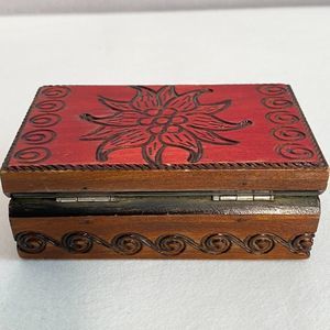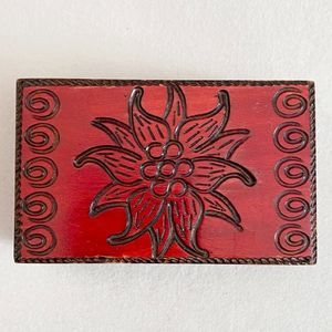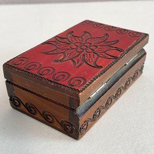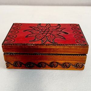 Wooden Engraved Trinket Box Red Top Chestnut Brown Sides Hinge Top