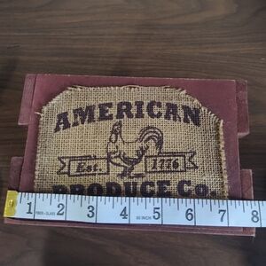 Wooden crate with burlap chicken decor.