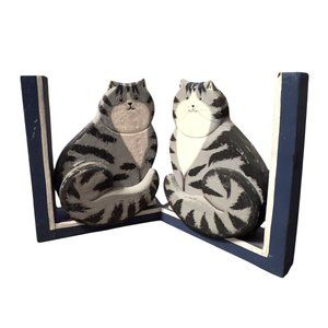 Wooden Gray Tabby Cat Bookends Blue & White Base
