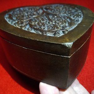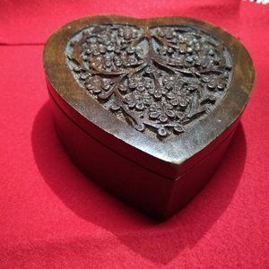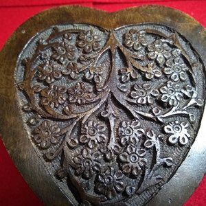 Beautiful Wooden Heart Shaped Box w/ Carved Flower / Floral Designs. Perfect for Valentine's Day. Box has two compartments. Can be used to hold trinkets and jewelry, etc. Pre-owned. The bottom tip has a small blemish (see photos), otherwise in very nice condition. Please see photos and feel free to message with any questions.