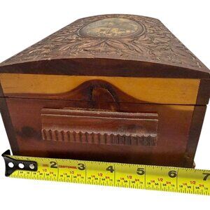 Wooden Jewelry Trinket Box Floral Carving Cottage Scene Mirror Rounded Lid Vtg
