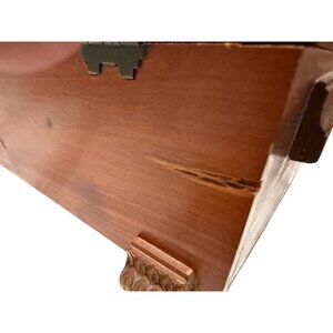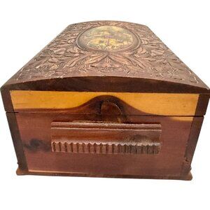 This handcrafted wooden jewelry box features intricate floral carvings, a cottage scene inlay, and a mirrored lid. It's both decorative and functional. • Hinged lid with interior mirror • Hand-carved floral design • Cottage scene inlay on top • Sturdy wooden construction Hasp of the closure is missing as shown in photo so box doesn't securely close but is still functional. Interior shows a small discoloration area.
