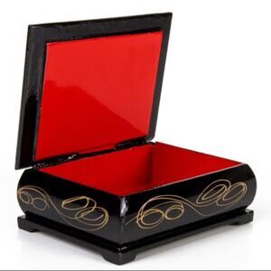 This listing is for previously owned handmade wood lacquer jewelry box in like new condition. No apparent flaws. Authentic Russian design. The lid carries an image of Nizhny Novgorod Kremlin. Gold accents all over sides and lid.