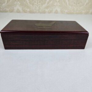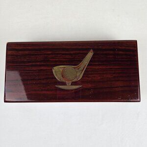 This is a lacquered, rectangular box with a removable lid. The lacquer is a red with black lines. On the top of the lid is a brass piece with a golf ball/club head design. A great piece to keep on a desk or shelf and keep small items inside.