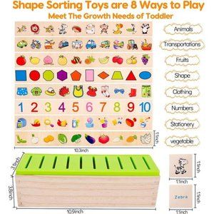 🧿【Wooden Color and Shape Sorting Box】There are 8 boards of different categories and 80 little wooden blocks . Kids can play in various way: finding the matching wood blocks for toddlers 1-3 and throwing into the classification sensory bin; naming the patterns; making stories with colorful blocks.Sorting toys for toddlers 2-4.