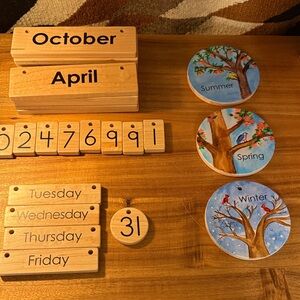 Beautiful wooden perpetual calendar featuring moon phases. Includes interchangeable month and day tiles. From Treasures from Jennifer. Perfect condition! Comes with stand or can hang on the wall. Original cost of calendar $260. Original cost of stand $65