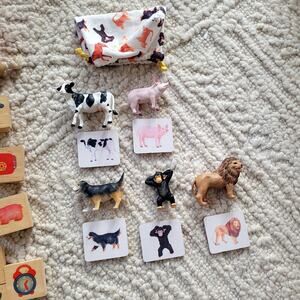 This is a bundle of wooden toys, including Plan Toys and Lovevery items, perfect for educational and engaging play! The set also includes ABC matching games to help your little one learn while having fun.