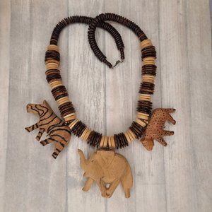 Wooden Safari Necklace with Zebra, Leopard, Elephant - Vintage