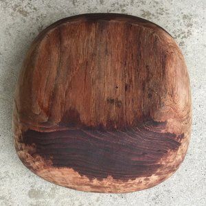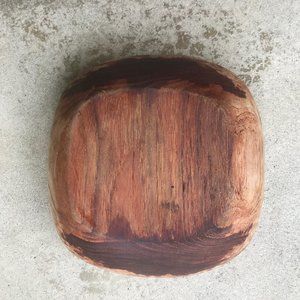 Wooden bowl. 10 x 10 x 3.5" Wood is dark from use. There are some white spots on rim (paint?). In fair used condition.