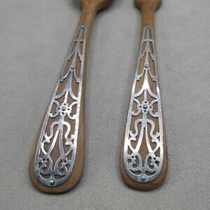Wooden Salad Serving Fork and Spoon Set with Silver Embellishments Vintage MCM. Very nice set of wooden salad serving fork and spoon set. Both utensils have silver embellishments on handles. Please see pictures.