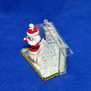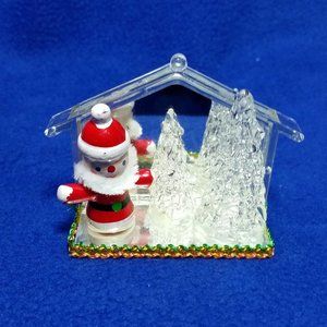 These unique ornaments feature a wooden Snowman on one ornament and a wooden Santa on another. Both ornaments have 2 spun glass Christmas trees. The bottom and back of each ornament are mirrors with ricrac material around the base.