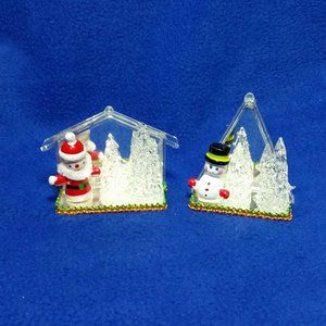 The Santa ornament measures 2 1/2" long, 1 1/4" wide and stands 2 1/4" tall. The Snowman ornament measures 2 1/4" long, 1 1/8" wide and stands 2 3/4" tall.